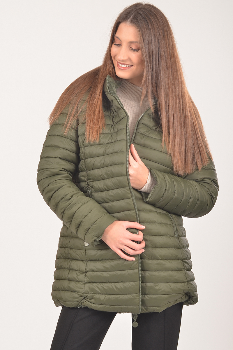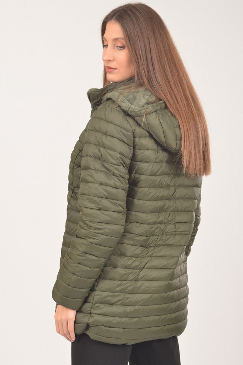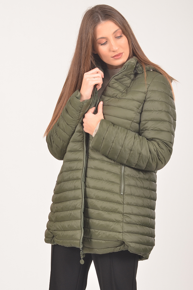 Μπουφάν διπλής όψης. Έχει κανονική γραμμή και κανονικό μήκος. Έχει γούνα από μέσα και φοριέται και απο τις δύο μεριές. Διαθέτει τσέπες στα πλαινά και απο τις δύο μεριές και αποσπώμενη κουκούλα. Δύο σε ένα επιλογή για όλα σου τα outfits.