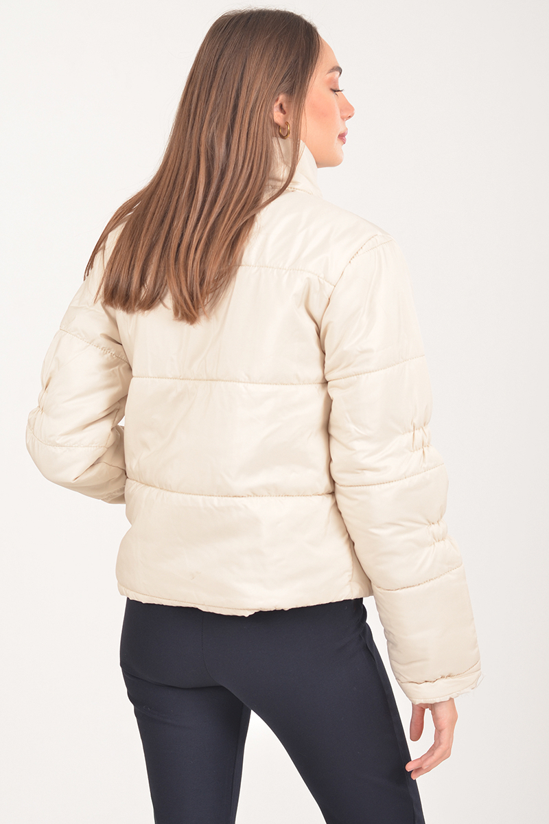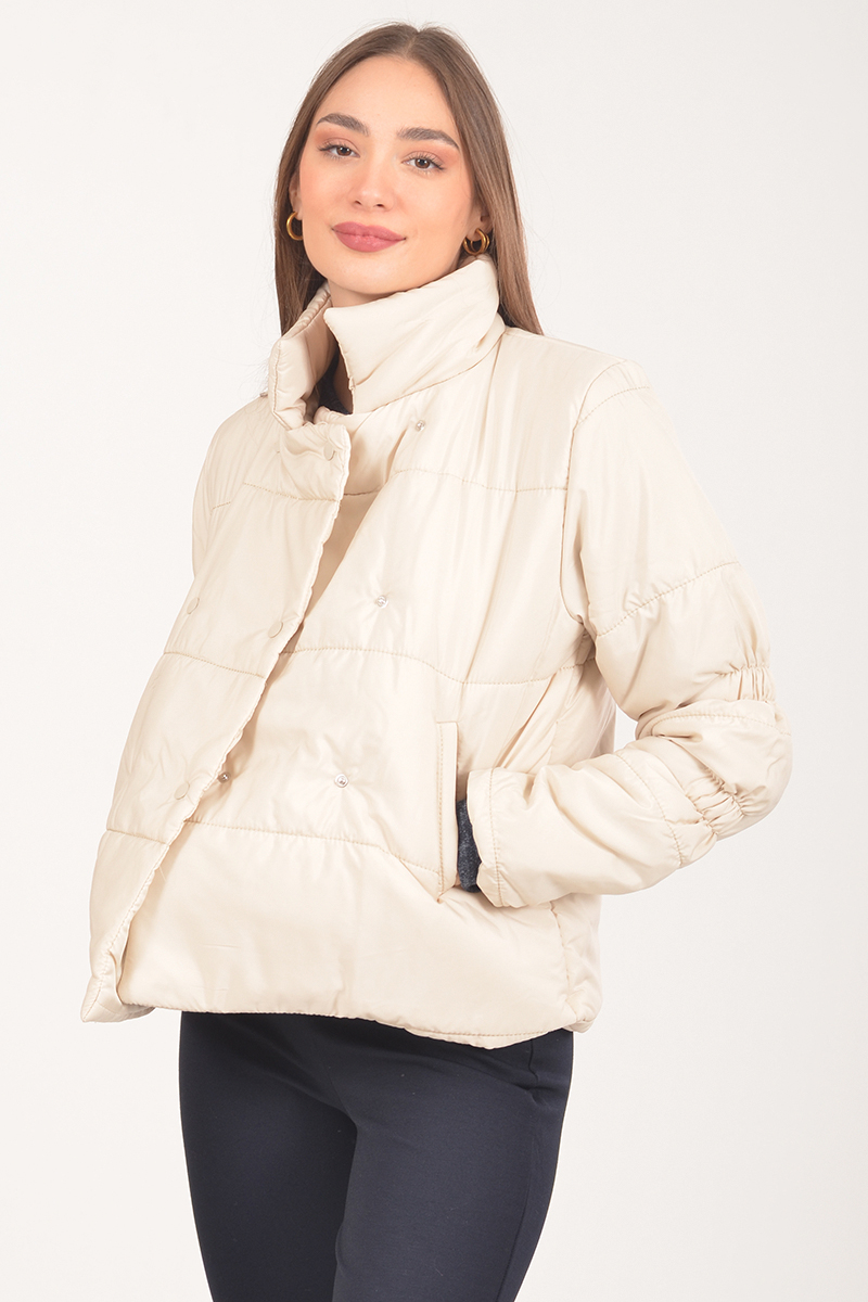Μπουφάν Puffer με κουμπιά. Έχει κανονικό μήκος και στενή γραμμή. Διαθέτει διπλά κουμπιά μπροστά για κλείσιμο. Άνετη και girly επιλογή που θα ταιριάξει με όλα τα outifit του χειμώνα.