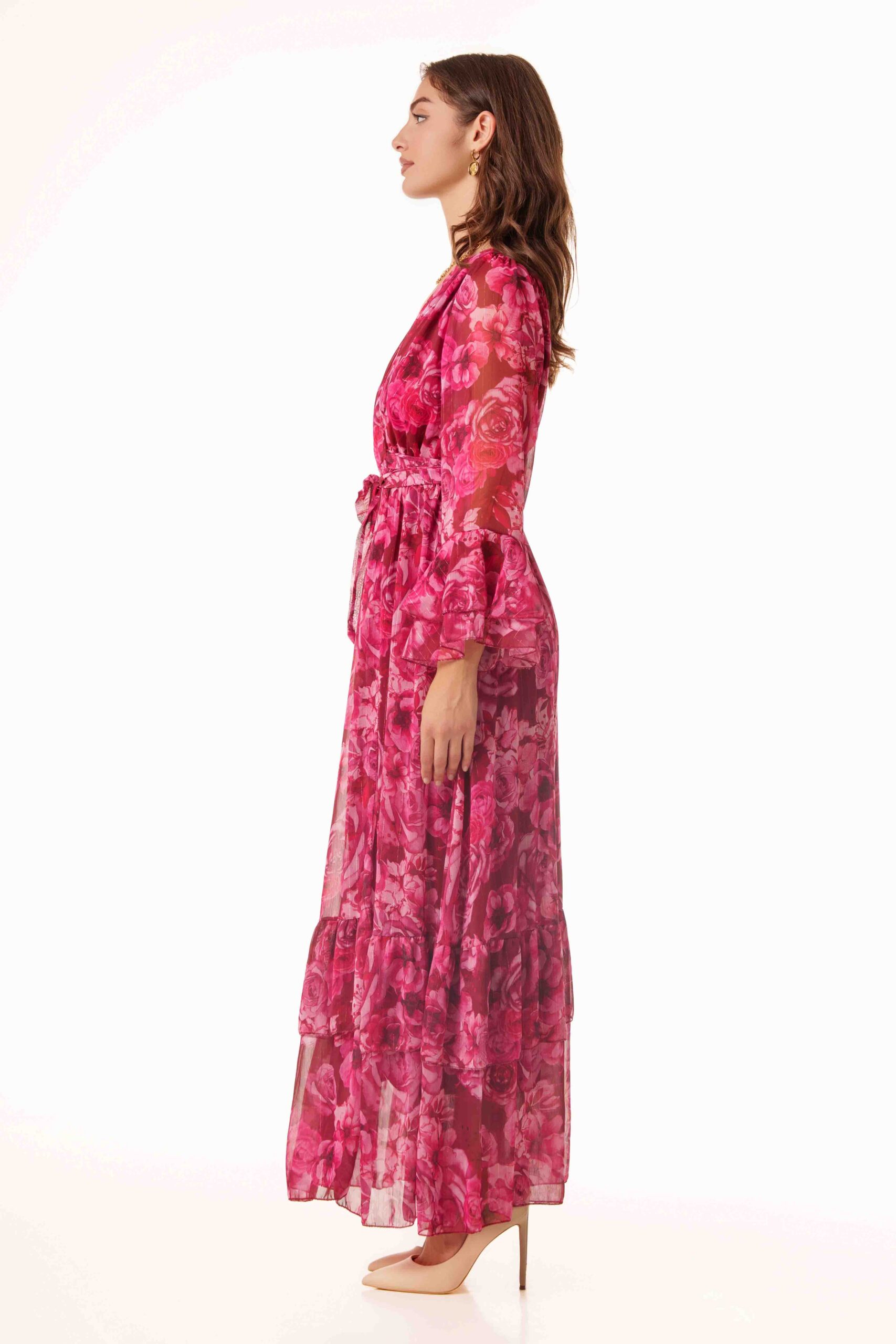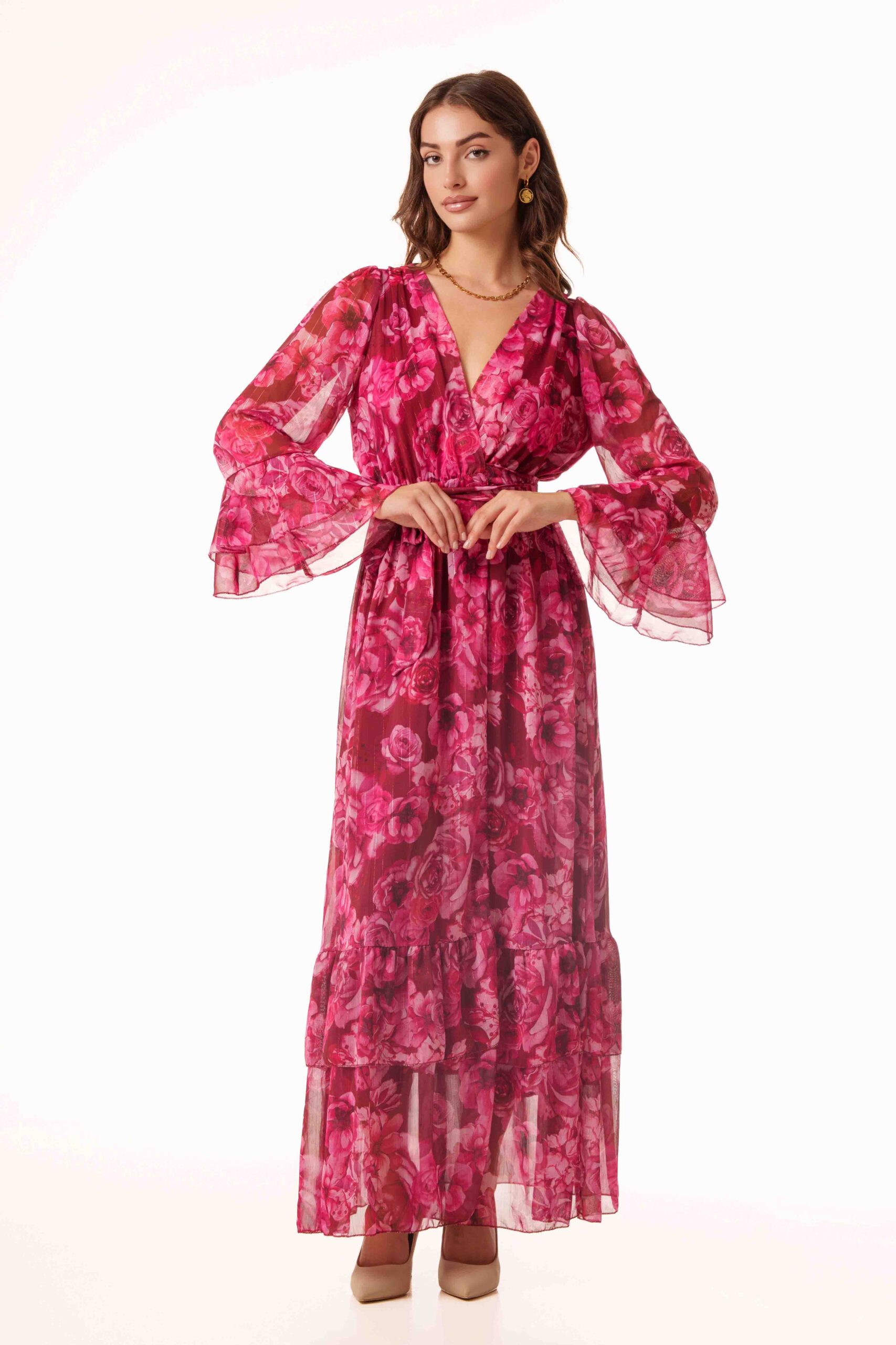 Φλοράλ μάξι φόρεμα. Έχει κανονική γραμμή και κανονικό μήκος. Είναι κρουαζέ, με άνοιγμα στο μπροστινό μέρος κ καμπάνα μανίκια. Διαθέτει λάστιχο στη μέση, κλείνει με ζώνη και είναι φοδραρισμένο. Το ύφασμά του είναι στολισμένο με ασημοκλωστή, έχει άνετη εφαρμογή και είναι onesize. Ιδανικό για βραδινές εμφανίσεις και πιο ιδιαίτερες περιστάσεις.