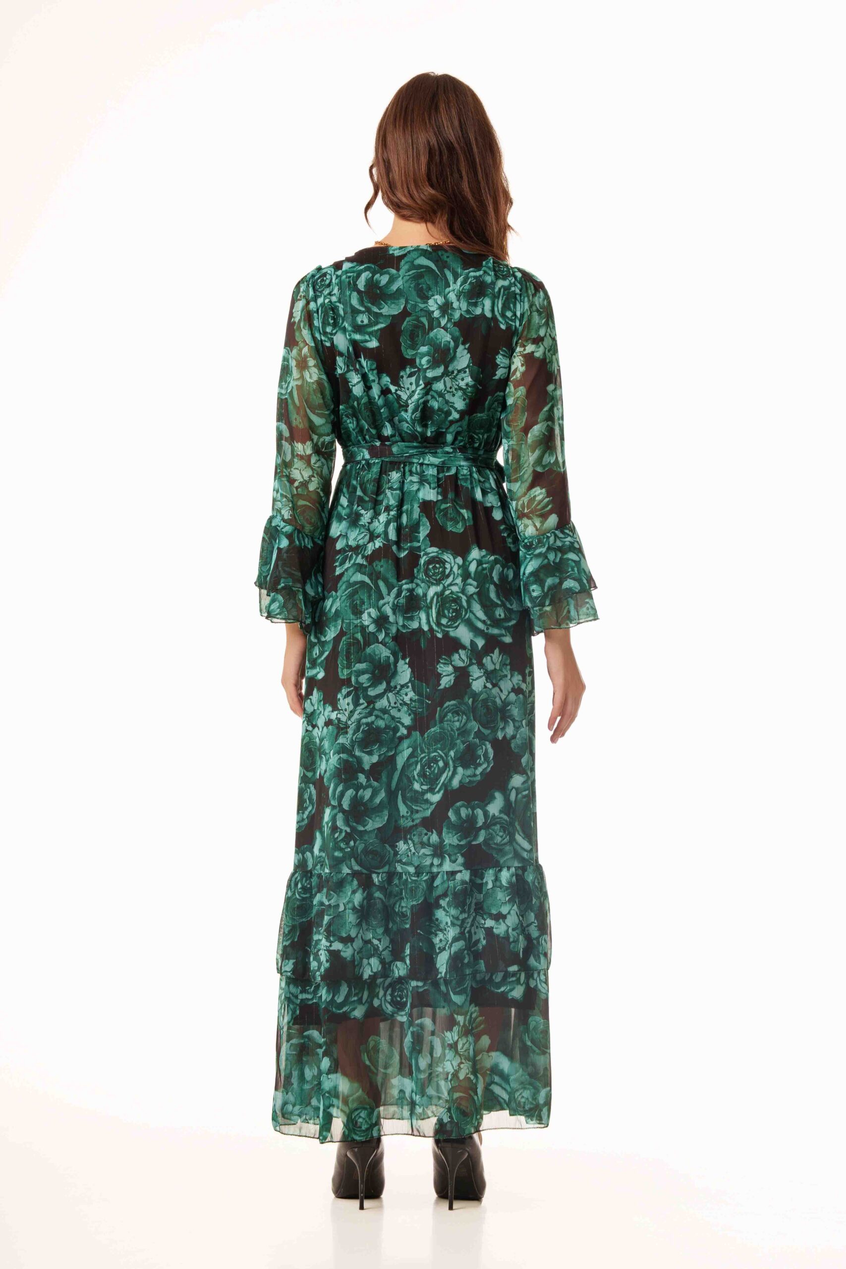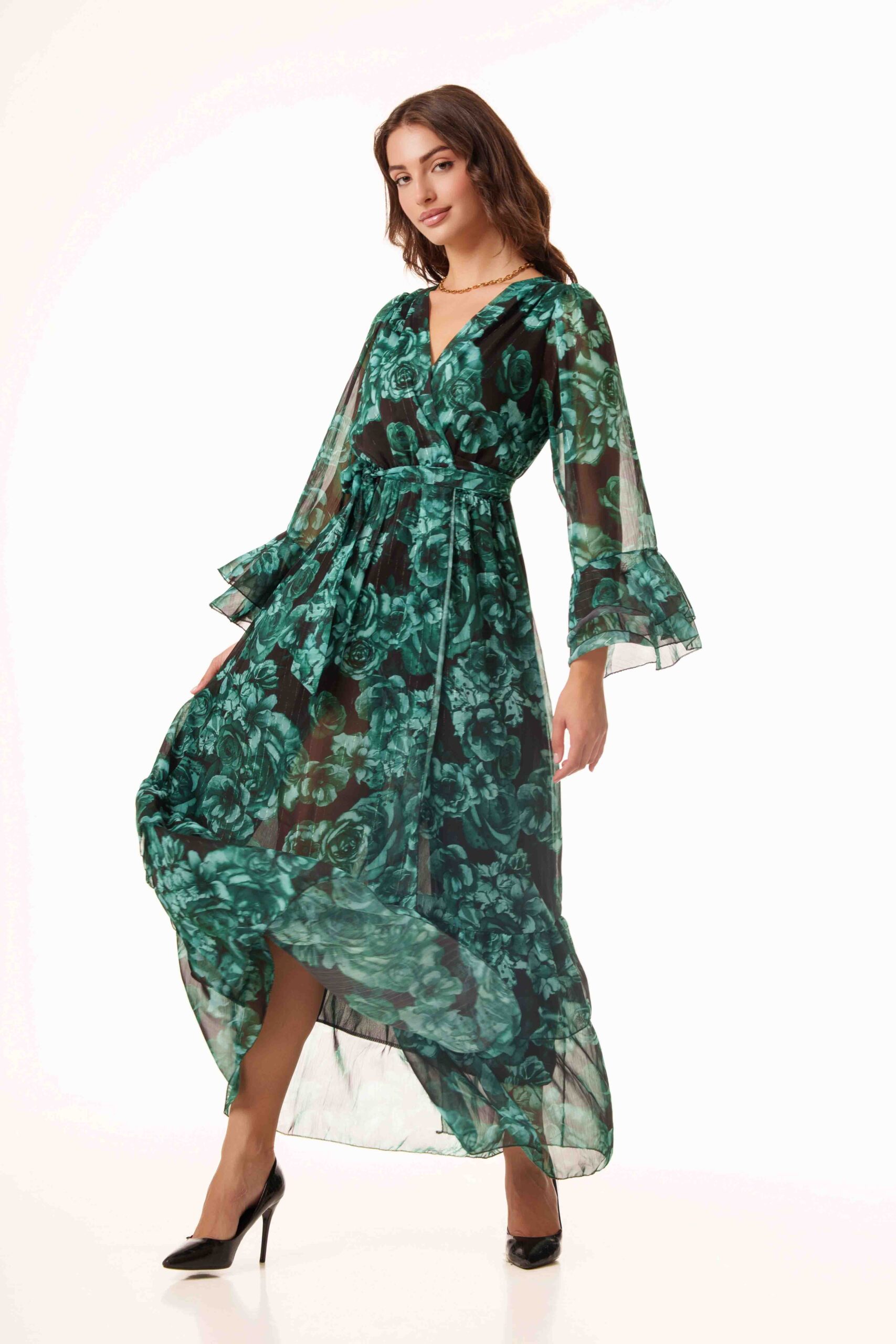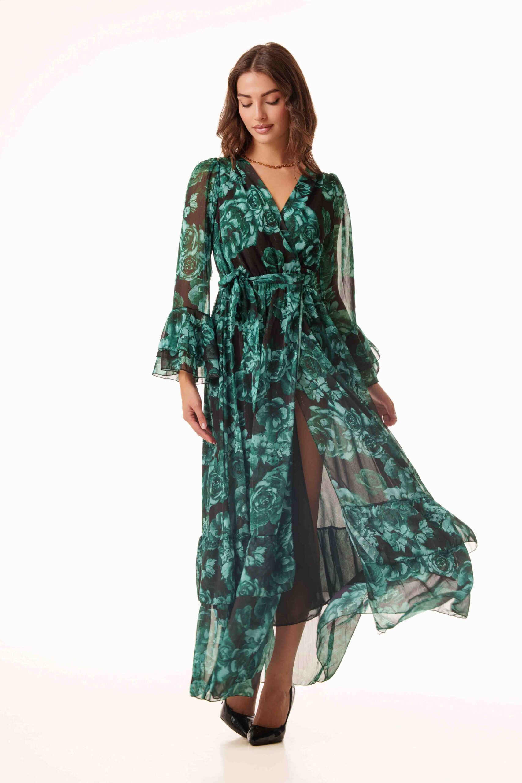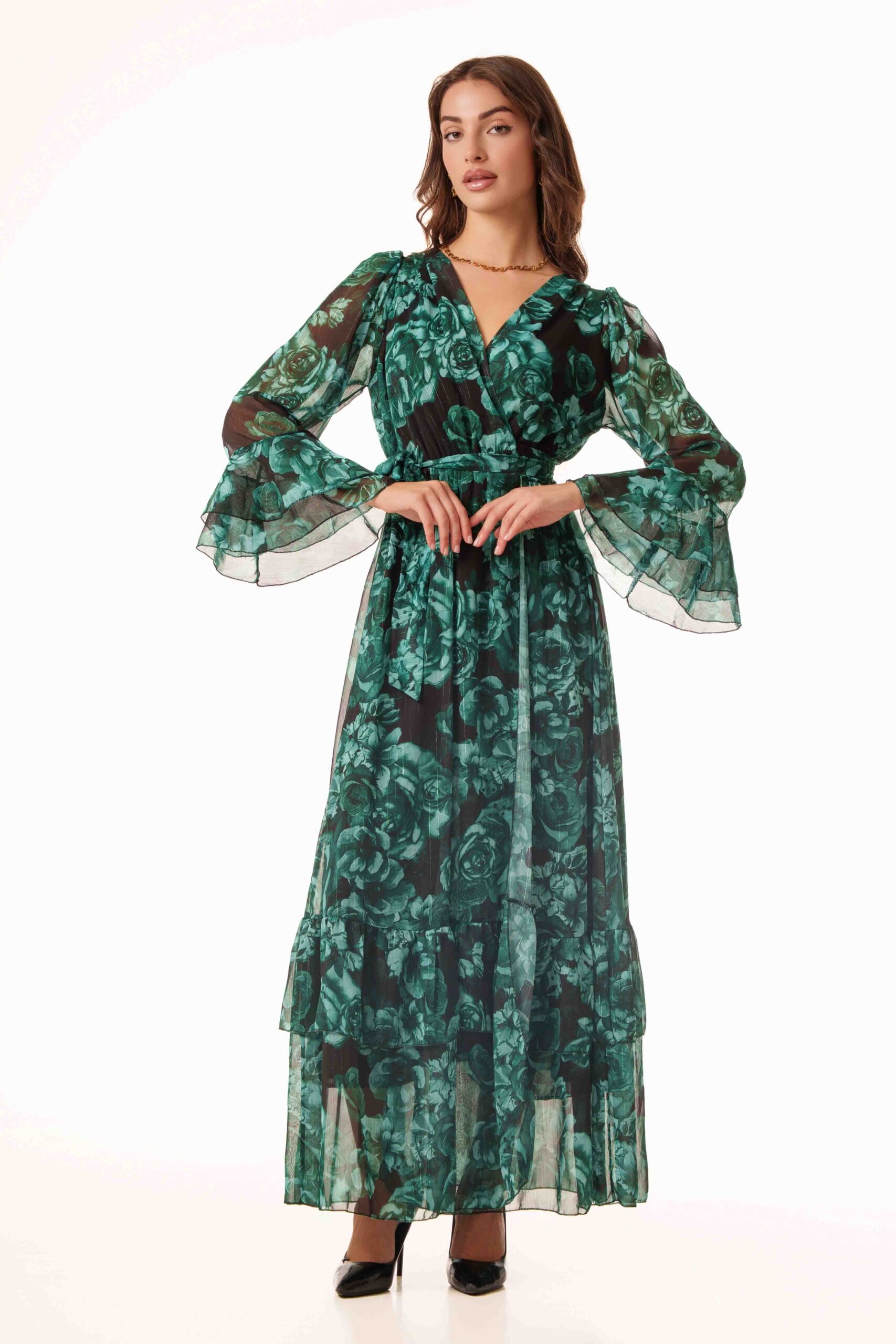 Φλοράλ μάξι φόρεμα. Έχει κανονική γραμμή και κανονικό μήκος. Είναι κρουαζέ, με άνοιγμα στο μπροστινό μέρος κ καμπάνα μανίκια. Διαθέτει λάστιχο στη μέση, κλείνει με ζώνη και είναι φοδραρισμένο. Το ύφασμά του είναι στολισμένο με ασημοκλωστή, έχει άνετη εφαρμογή και είναι onesize. Ιδανικό για βραδινές εμφανίσεις και πιο ιδιαίτερες περιστάσεις.