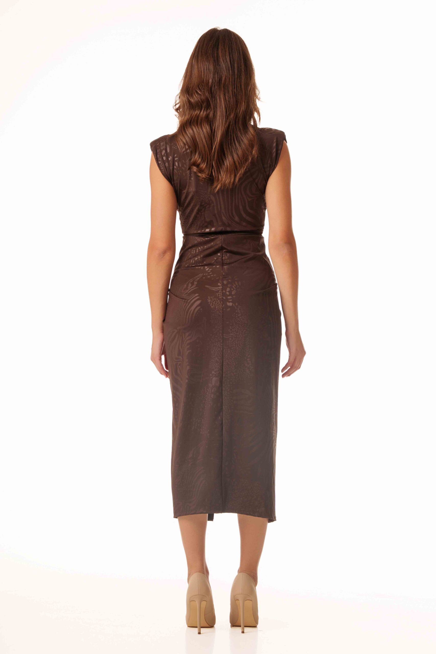 Φόρεμα με κόμπο. Έχει κανονικό μήκος και κανονική γραμμή. Διαθέτει βάτες και V λαιμόκοψη. Είναι midi με σούρες και άνοιγμα στο μπροστινό μέρος. Έχει ελαστική εφαρμογή και ανάγλυφο amimal print. Η απόλυτη τάση για να είσαι πάντα μοδάτη και στυλάτη.