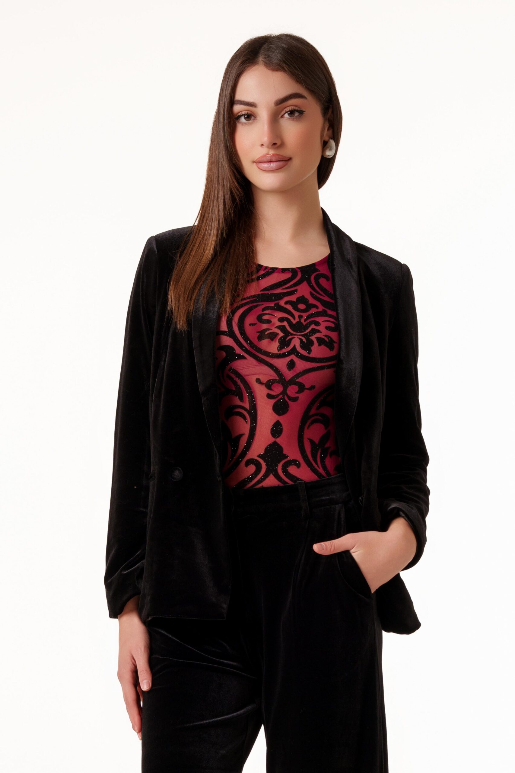 Σακάκι βελούδο blazer. Έχει κανονικό μήκος και άνετη γραμμή. Διαθέτει γιακά, τσέπες στα πλαινά και κουμπί μπροστά για κλείσιμο. Η πιο σικάτη επιλογή για να απογειώσεις την εμφάνιση σου.